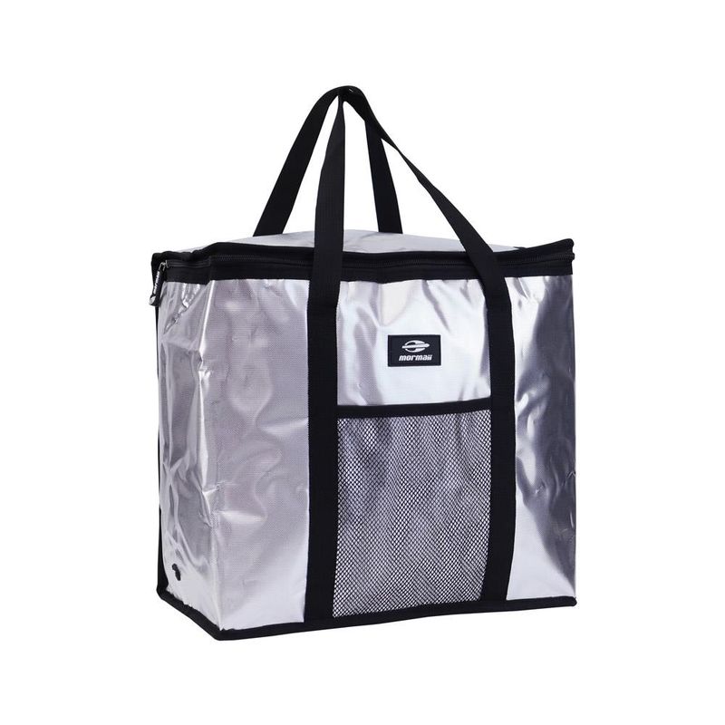 Bolsa térmica Mormaii prateada 25 litros dimensoues 35,5x33x20cm, possui alças manuais, zipper e logo em borracha, perfeito para transportar bebidas e alimentos
