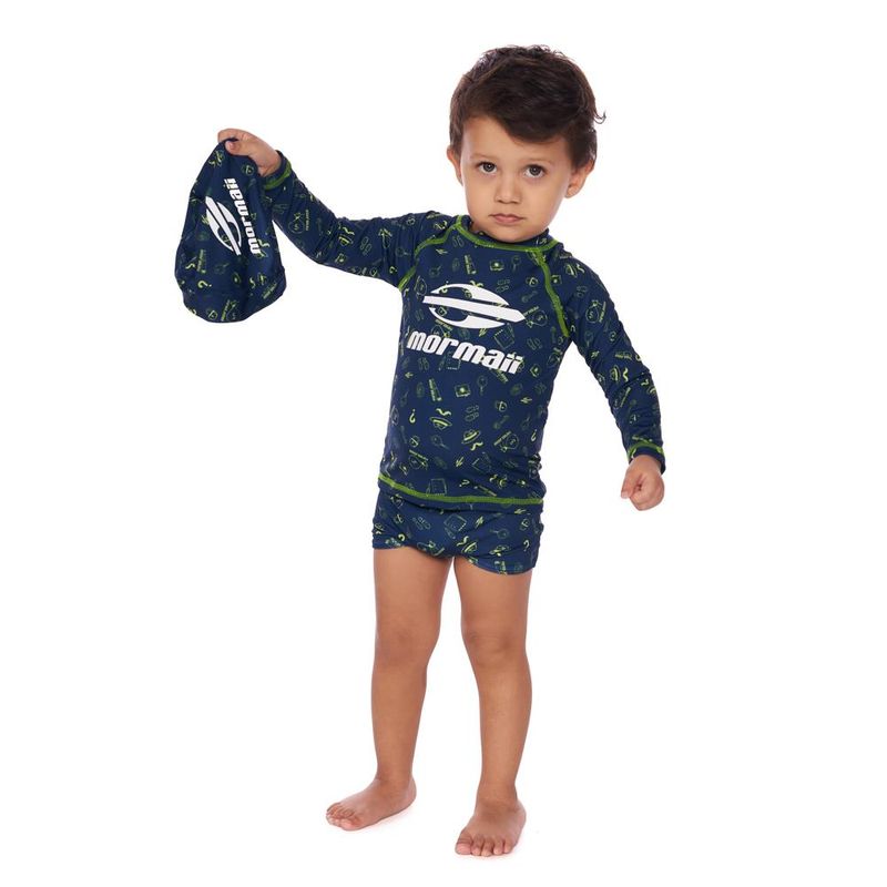 Conjunto de sunga boxer com touca natação, ambas contêm estampa inspirada em bebê agente secreto e estampa silk com logomarca sobreposta. Perfeita para praticar natação ou fazer a festa na praia e piscina.