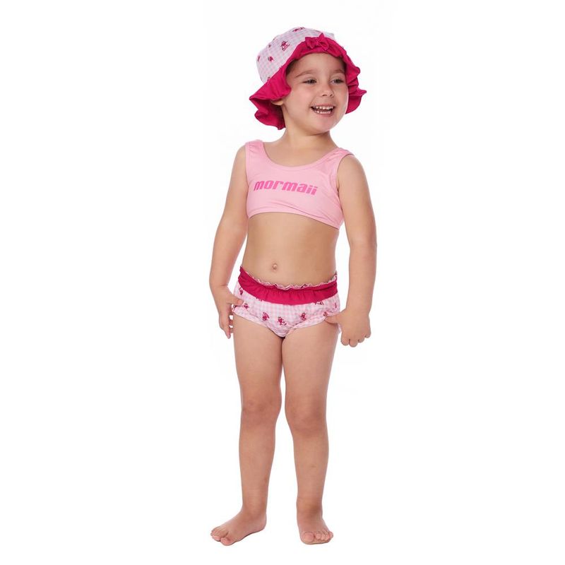 todas as peças são confeccionadas em tecido leve e elástico. O chapéu tem sua borda da costura em babados e um laço rosa na parte da frente do chapéu. O top é reto e inteiro, proporcionando segurança e conforto para a bebê se divertir. A calcinha é um tapa fralda com babadinhos. A estampa foi inspirada em morangos atléticos, com logomarca por toda a peça.