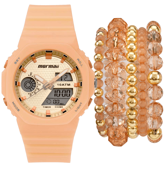 Com um mostrador metalizado e toques vibrantes de cor, este relógio é uma verdadeira declaração de moda para o pulso. E para adicionar ainda mais personalidade ao seu estilo, ele vem acompanhado de um kit exclusivo de pulseiras de miçangas transparentes. Com uma caixa de 43,5mm e resistência à água de até 100 metros, este relógio é perfeito para todas as suas atividades diárias.