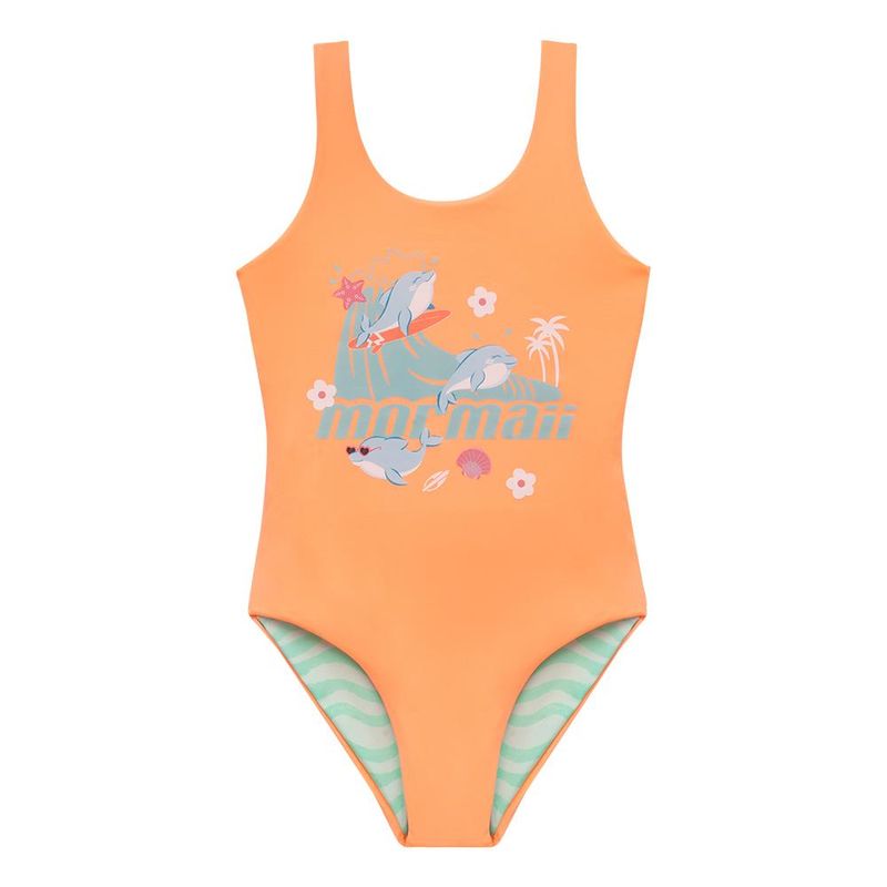 O maiô regata dupla face traz brincadeira e praticidade. O modelo pode ser usado com o lado liso com uma estampa de golfinhos exclusiva ou todo com o estampado rotativo de ondas, deixando a hora de se divertir ainda mais legal.