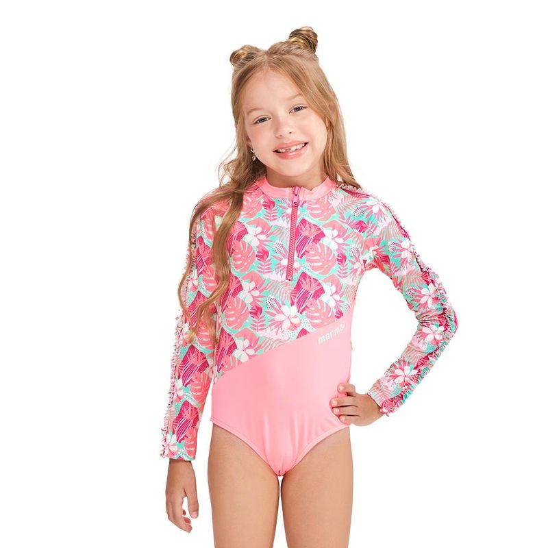 Maiô confeccionado em tecido com tecnologia proteção uv 50+ e zÃper tratorado frontal. Contém recortes e estampa silk logo Mormaii na parte frontal, além de mangas longas com detalhe de babados. Perfeito para as crianças curtirem os dias de sol com mais segurança,