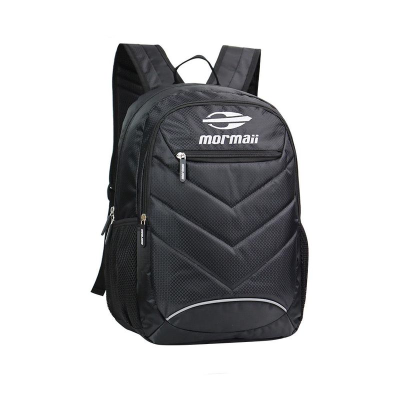 Mochila de costas 25 litros Mormaii; dimensões 45 x 30 x 18cm; possui costuras duplas reforçadas, alça superior para ser pendurada, zíper bi-derecionais, alças nas costas acolchoadas e ajustáveis, bolsos laterais, compartimento para notebook.