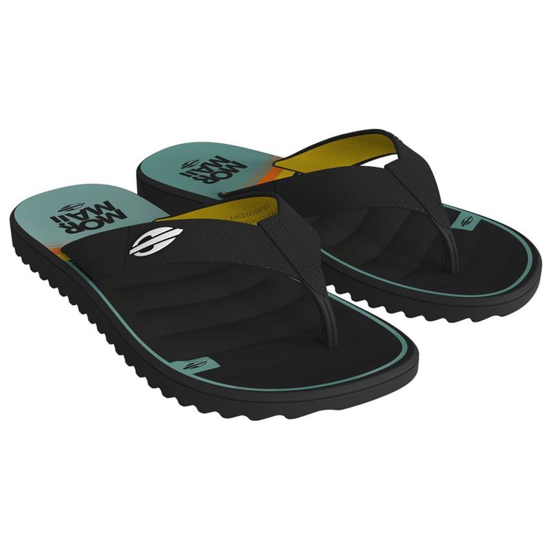O chinelo Mormaii tai dedo traz toda a descontração do lifestyle de Mormaii através de sua grafia inspirada nos blocos de cores das pranchas de surf, marcando o calcanhar do produto e trazendo o logo de forma descontraída. Para combinar, a parte interna da forquilha recebe serigrafia em tom contrastante. Texturas de alta definição compõem parte de cima do chinelo, remetendo a fita têxtil. A palmilha traz volumetrias em gomos que dão a sensação de conforto e ganha um toque especial com o logo de Mormaii em forma de etiqueta.