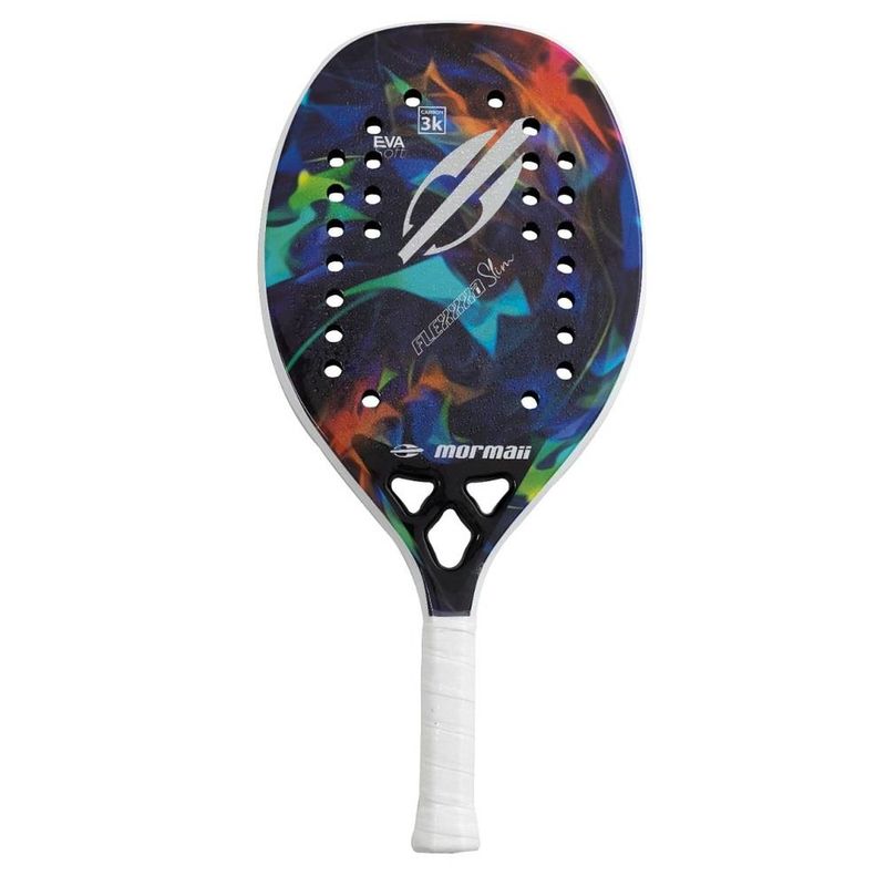 Raquete beach tennis Mormaii flexxxa slim; equipamento pensado e desenvolvido para prática de beach tennis; frame em carbono e face em carbono 3k.eva de alta qualidade. Diferente dos outros modelos é 2mm mais estreita. Ótima elasticidade e resistência. Possui 32 furos e coração com 3 furos. Recomendada para nível avançado e profissional. Boa potência e ótimo controle. Capa protetora incluída.