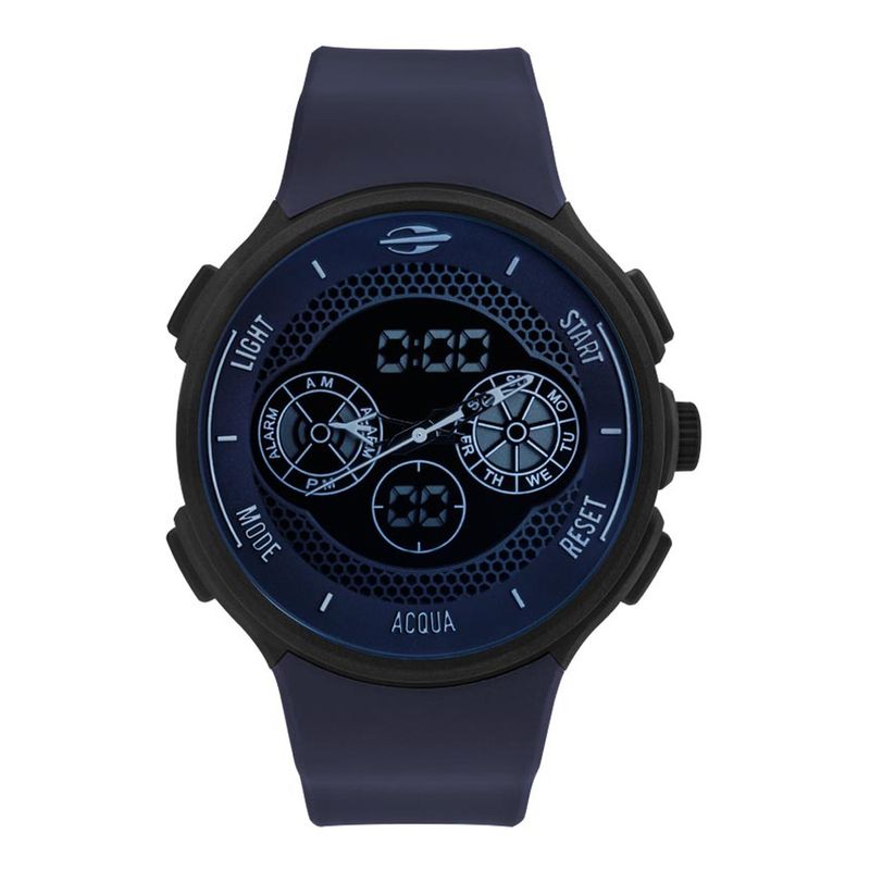 Relógio Mormaii da Linha Acqua a prova dágua 10 atm, modelo analógico e digital, com pulseira de silicone azul e caixa em polímero 49mm, produto com lente colorida azulada e display luminoso negativo.