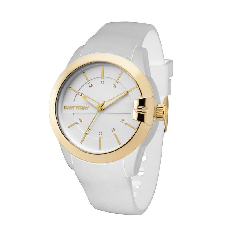 Relógio mormaii com desing moderno que nunca sairá de moda! modelo analógico com caixa em polímero na cor branca e pulseira de silicone na cor branca, apresentando uma combinação do branco com dourado que deixará seu look perfeito. possui ainda resistência a agua de 5atm..