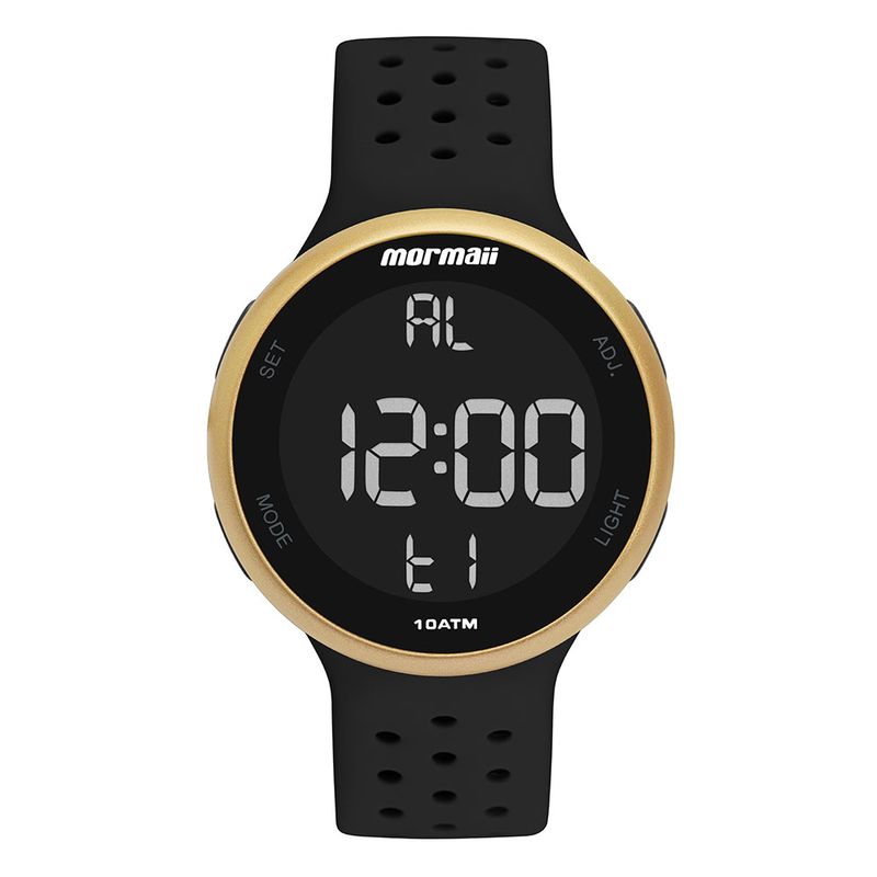 Relógio mormaii unissex da nossa querida linha digi, modelo na versão redonda bicolor com pulseira de silicone preta e caixa de polímero dourada. com display lcd negativo e à prova dágua 10 atm! caixa 43 mm com encaixe perfeito no pulso.