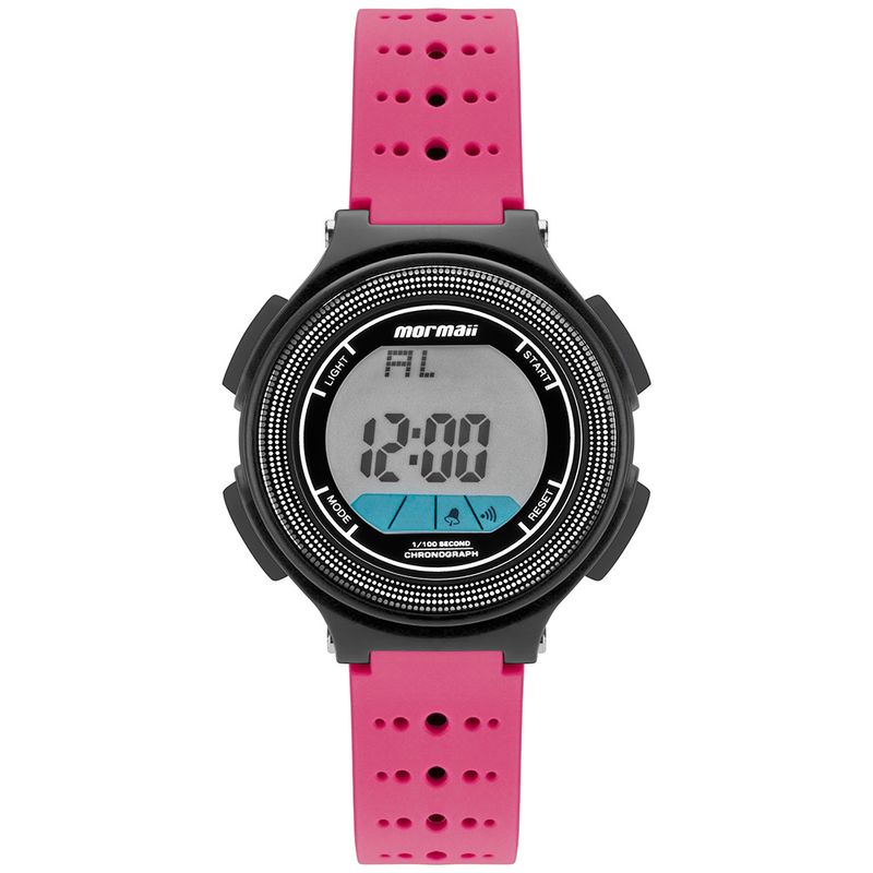 Relógio mormaii da linha a versão kids, com o conceito mini me, esses modelos são inspirados em produtos best sellers da marca, mas em uma versão menor, modelo com pulseira rosa e caixa preta 38mm em polímero, item com luzes que mudam de cor, a prova dágua 100m.