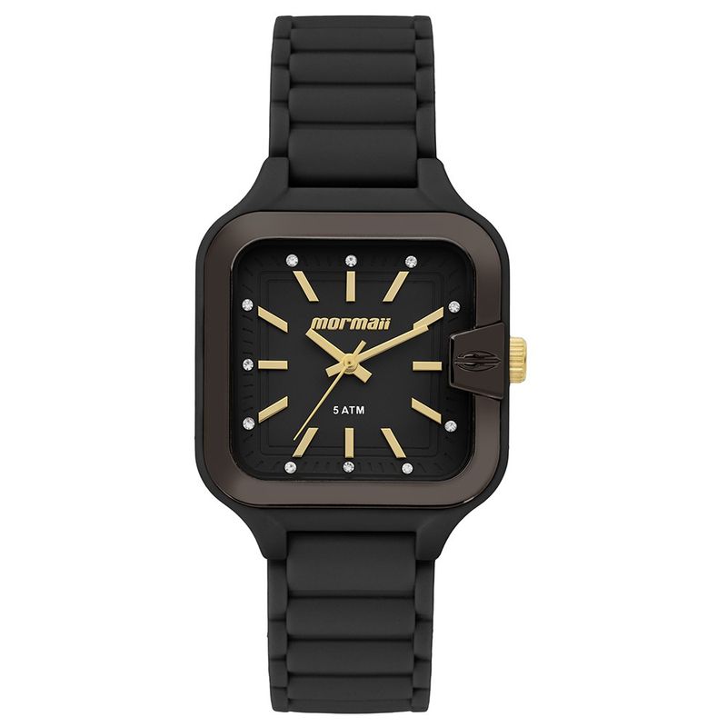 A linha luau chega com modelo que une conforto e elegância em um design leve e moderno. Com caixa quadrada em polímero de textura emborrachada e silicone aveludado, o relógio traz tamanho confortável para o pulso feminino e mostrador em relevo com aplicação de pedras nas marcações de horas que dão um toque sofisticado. Disponível na cor preta com acabamentos metalizados no aro externo, ele é perfeito para completar o visual com estilo. Além disso, o relógio apresenta resistência à água de 50 metros.