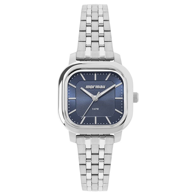 A linha neo vintage apresenta modelo com caixa quadrada em tamanho pequeno e minimalista, trazendo delicadeza e modernidade ao visual. O mostrador azul recebe textura linear central com marcadores em relevo e ponteiros polidos com interior branco, garantindo clareza na leitura das horas. Já a pulseira em aço, construída em 5 elos que combinam os acabamentos escovado e polido, entrega um visual sofisticado e moderno com fecho gancho de ajuste prático. Além disso, o relógio apresenta banho em prata e resistência à água de 50 metros.