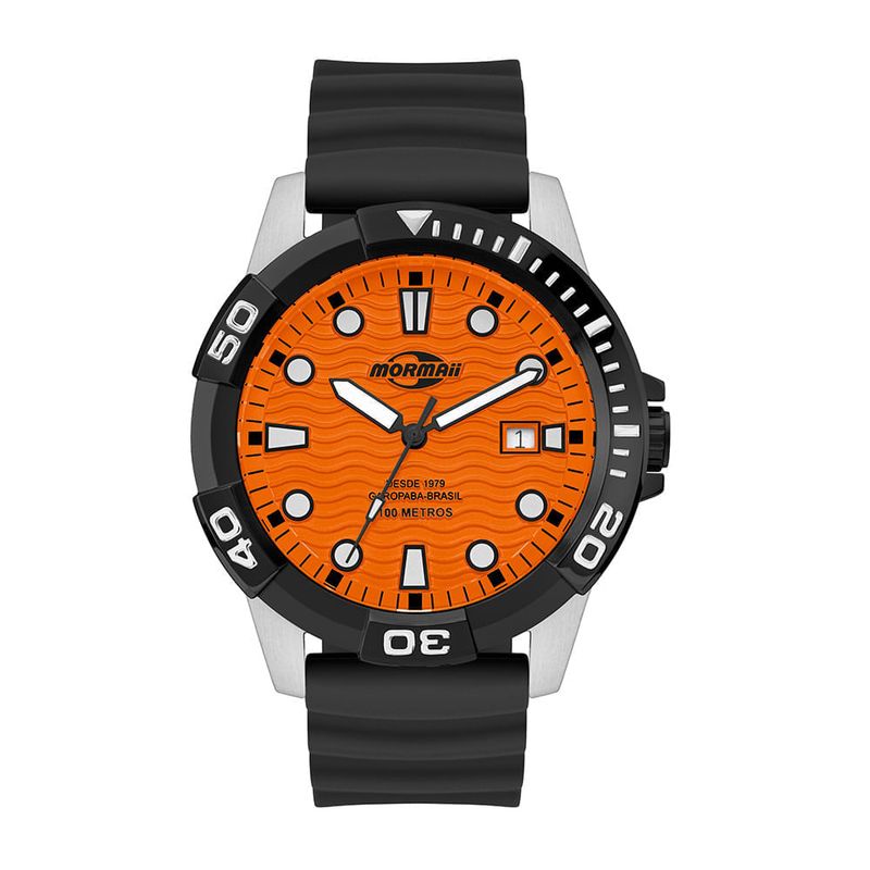 A linha steel apresenta seu novo modelo inédito, feito em aço inoxidável e com visual moderno que combina estilo e resistência para quem vive em movimento. Com design inspirado no estilo diver, o modelo conta com aro rotativo unidirecional com destaque nos primeiros 20 minutos, lúmen nos ponteiros e marcadores de hora, fundo rosqueado, mostrador com padrão de ondas e efeito degradê em cores de destaque, e calendário na posição das 3 horas, ideal aventuras de mergulho. A pulseira de silicone tipo ?Accordion? Com fivela em aço inoxidável completa o visual moderno no pulso. Além disso, o relógio apresenta resistência à água de 100 metros.