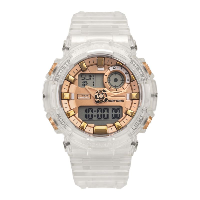 Relógio Mormaii Sports chega com seu novo modelo, super diferenciado, em polímero branco translúcido! Com uma caixa de 45mm e detalhes metálicos no mostrador, ele foi feito para ser um relógio esportivo e resistente, com 100 metros de resistência à água e suas funções de calendário, cronógrafo, alarme, cronômetro, dual time e luz noturna para ambientes escuros.