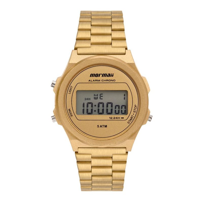 Relógio Mormaii vintage dourado, com caixa redonda e pulseira de aço em 3 links! Super versátil e com 50 metros de resistência à água, é o relógio perfeito para te acompanhar em qualquer lugar. Com maquinismo digital, ele possui as funções de calendário, cronógrafo, alarme e luz noturna para ambientes escuros. Tamanho de caixa 35mm.
