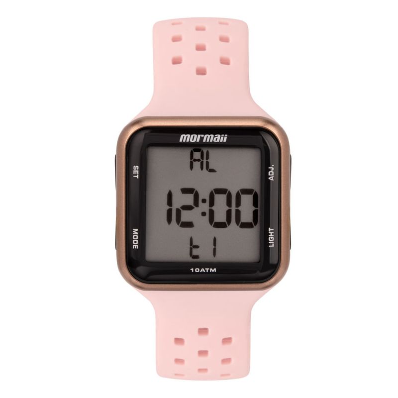 Relógio Mormaii digi com caixa rosé de polímero 38mm e pulseira rosa de silicone, que deixam o relógio leve e confortável. O mostrador lcd positivo facilita a leitura das horas e a resistência à água de 100 metros o transforma no parceiro ideal para qualquer momento.