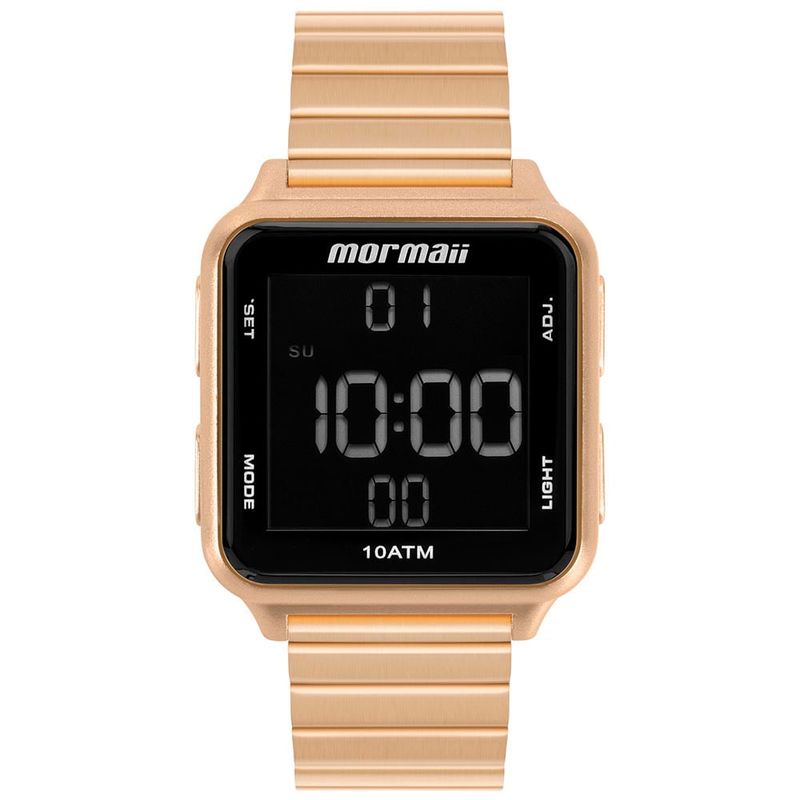 A linha Digi combina caixa em polímero com pulseira de aço inoxidável em elo único, trazendo estilo e resistência em um só modelo. Com display de LCD positivo, oferece funções como indicador de dia, mês e semana, alarme, cronômetro, aviso sonoro de hora em hora e luz noturna para auxiliar em ambientes escuros. Disponível na cor rosé, o relógio garante estilo único ao pulso, e apresenta resistência à água de 100 metros, capaz de tornar experiências incríveis.
